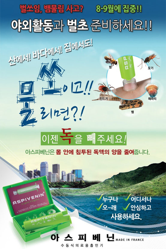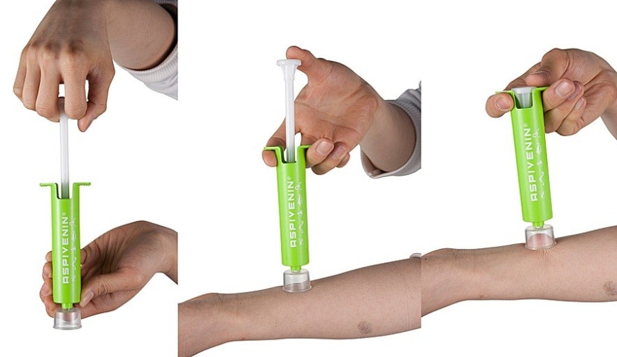 아스피베닌은 피부에 남은 독이나 자극 물질을 음압으로 흡입해 제거하는 응급도구입니다.