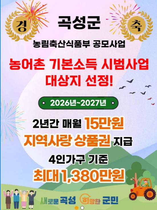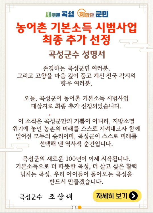 곡성군이 농림축산식품부 '농어촌 기본소득 시범사업' 추가 선정으로,