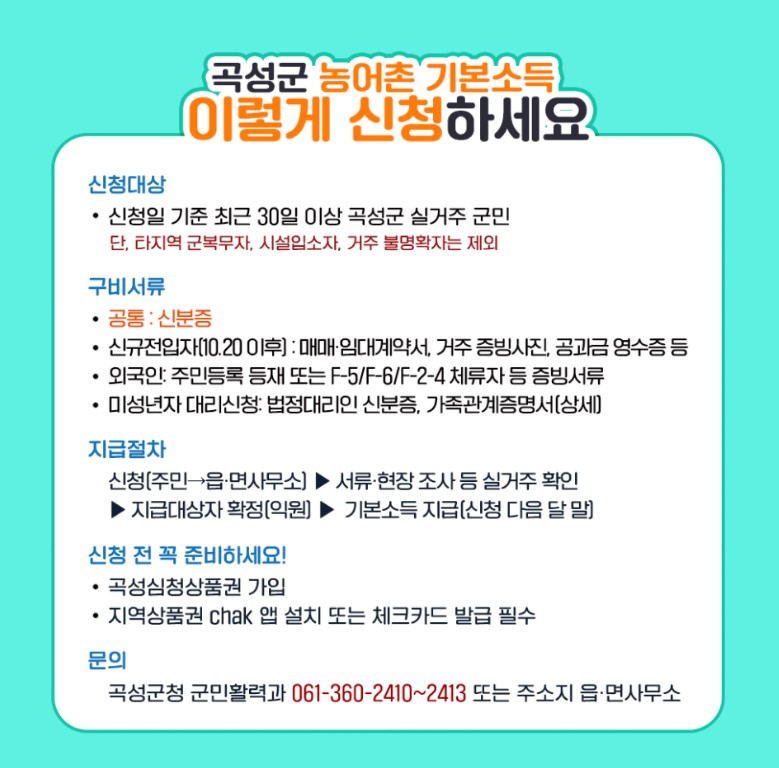 - 곡성군에 주민등록 + 30일 이상 실제 거주한 주민 대상